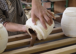 型打ちろくろと押型の複合技。ろくろで引いた粘土を石膏型に置いてたたいて形作る。不定形をたくさん作るのに向いている。 |
