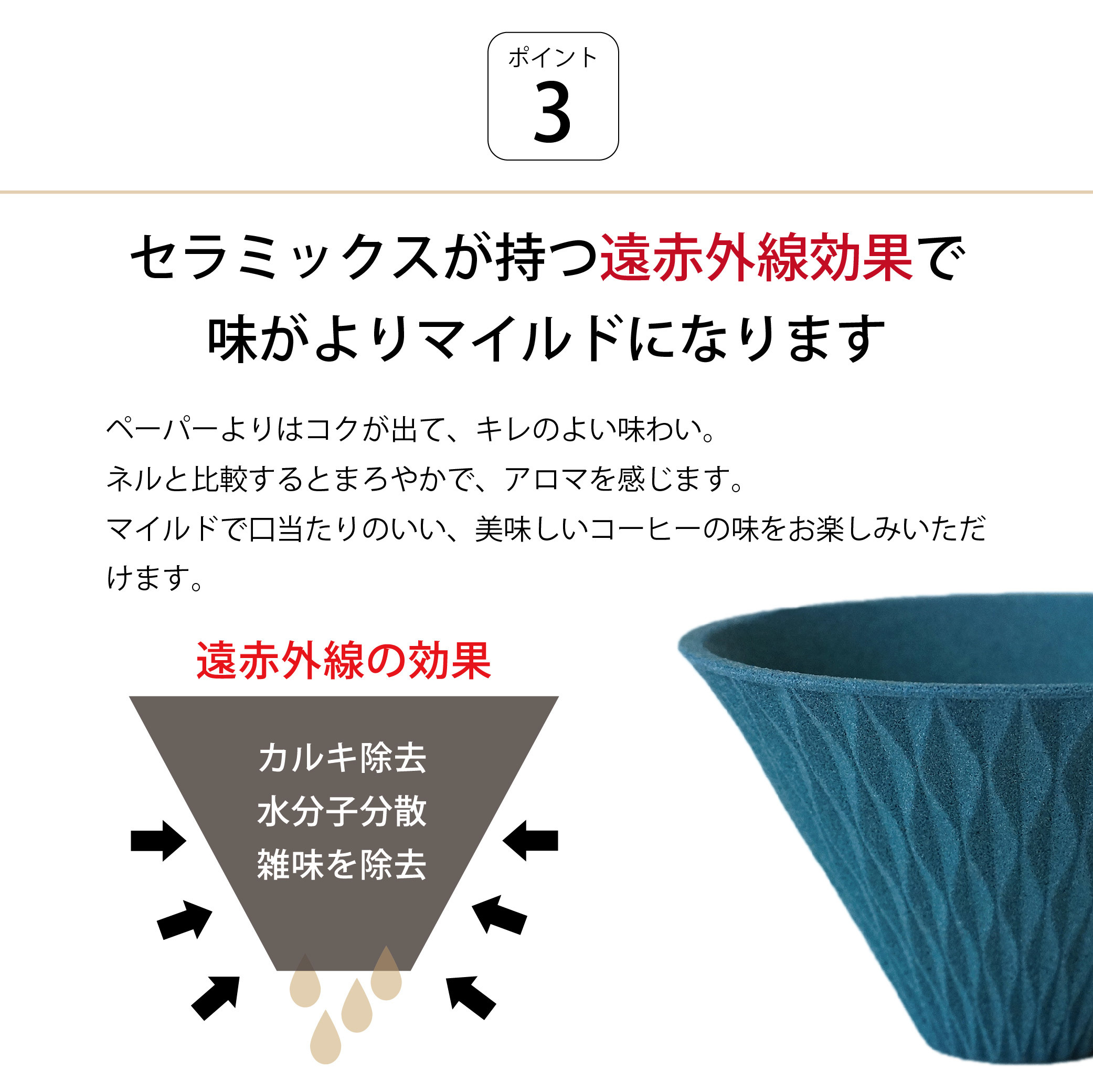 波佐見焼の独自技術で開発した多孔質セラミックフィルターを使うことにより、ペーパーレス化を促進し、紙フィルターのゴミの削減や、紙の原料となる森林の伐採を抑えることにつながります。